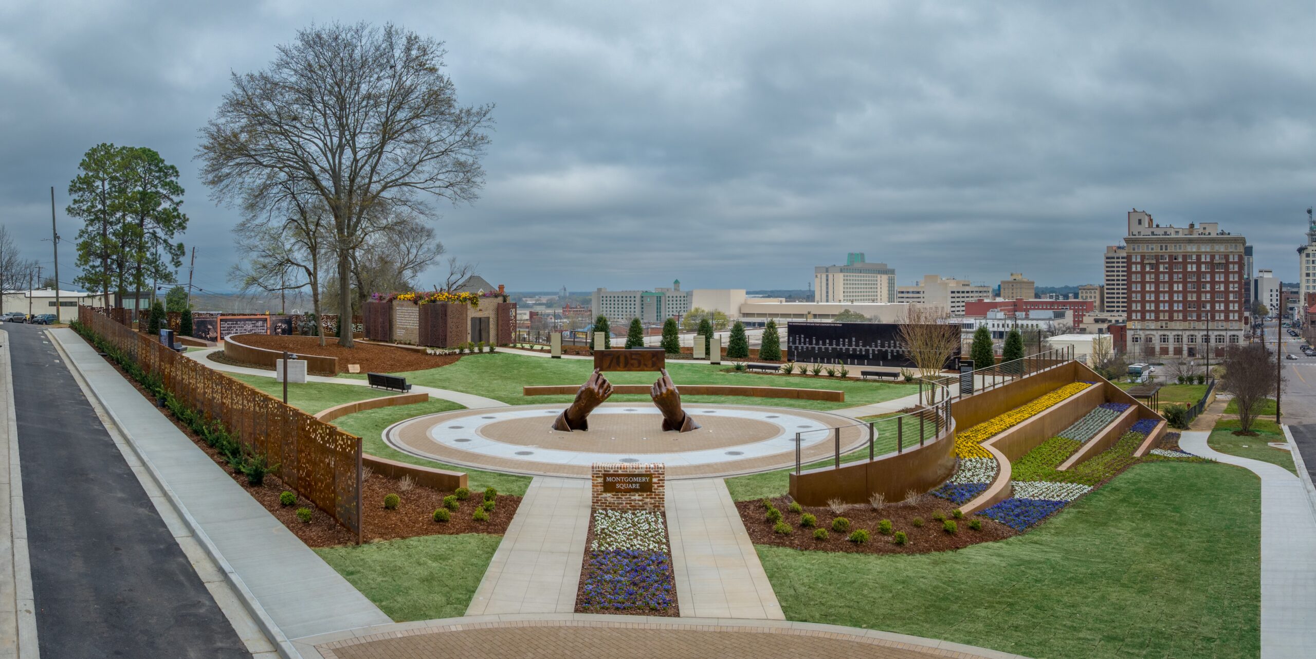 Montgomery Square builds on our existing Legacy Sites, and like the Legacy Museum, National Memorial for Peace and Justice, and Freedom Monument Sculpture Park, it is animated by the power of place. The mostly outdoor site is located next to the Elevation Convening Center and Hotel, at the top of Montgomery Street—the very street where tens of thousands of people marched on the final leg of the historic Selma to Montgomery March on March 25, 1965.